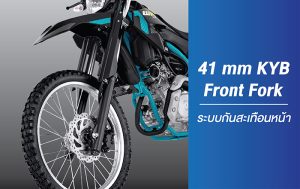 ระบบกันสะเทือนหน้าแบบ Telescopic จาก KYB 41 mm. KYB Front Fork ระบบกันสะเทือนหน้าแบบ Telescopic จาก KYB ด้วยแกนโช้คขนาด 41 มม. ช่วยดูดซับแรงสั่นสะเทือนได้อย่างดีเยี่ยม สร้างความเร้าใจในแบบ Enduro