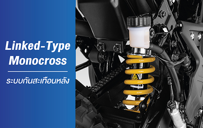 Linked-Type Monocross ระบบกันสะเทือนหลังแบบ Monocross ร่วมกับกระเดื่องซับแรง สามารถปรับค่าความแข็งได้ 5 ระดับตามน้ำหนักผู้ขับขี่ ตอบสนองการขับขี่ทุกเส้นทางได้เป็นอย่างดี