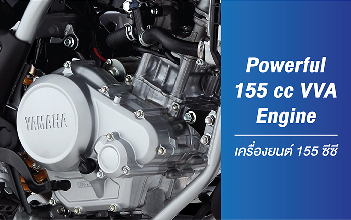 เครื่องยนต์ 155 ซีซี VVA น้ำหนักเบา ระบายความร้อนด้วยน้ำ พร้อมระบบหัวฉีดเชื้อเพลิง Powerful 155 cc VVA Engine ด้วยสมรรถนะเครื่องยนต์ 155 ซีซี VVA น้ำหนักเบา ระบายความร้อนด้วยน้ำ พร้อมระบบหัวฉีดเชื้อเพลิง เทคโนโลยีลิขสิทธิ์เฉพาะของยามาฮ่า ที่มาพร้อมถังน้ำมันความจุขนาด 8.1 ลิตร ให้คุณไปได้ไกลกว่าเดิม
