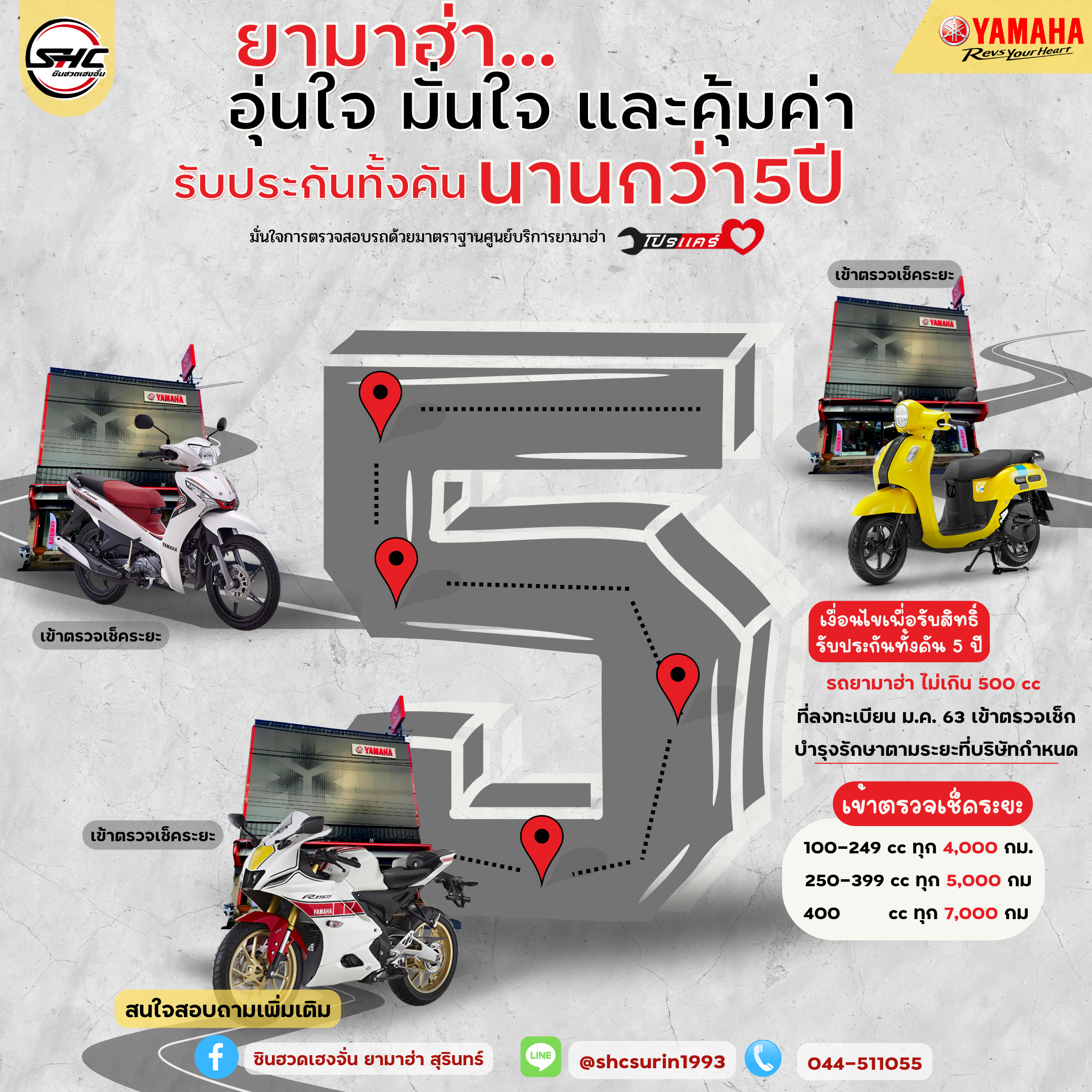 บริษัท ไทยยามาฮ่ามอเตอร์ จำกัด ผู้ผลิตและจำหน่ายรถจักรยานยนต์ชั้นนำของประเทศไทย ตอกย้ำความเป็นผู้นำในแบรนด์รถจักรยานยนต์ของประเทศไทยที่กล้ารับประกันคุณภาพสินค้าทั้งคันตลอดระยะเวลา 5 ปี หรือ 50,000 กิโลเมตร สำหรับลูกค้ารถจักรยานยนต์ยามาฮ่าทุกรุ่นขนาดเครื่องยนต์ไม่เกิน 500 ซีซี ที่ได้ลงทะเบียนรับประกันคุณภาพสินค้าหลังจากวันที่ซื้อสินค้า จะได้สิทธิ์รับประกันคุณภาพทุกชิ้นส่วนเป็นเวลา 5 ปี หรือ 50,000 กม. แล้วแต่ระยะใดถึงก่อน ไม่รวมอะไหล่สึกหรอตามอายุการใช้งาน ทั้งนี้ต้องนำรถเข้าตรวจเช็กตามระยะที่บริษัทฯกำหนด โดยสามารถรับสิทธิ์ได้ตั้งแต่วันนี้เป็นต้นไป และพิเศษ สำหรับยามาฮ่า ฟินน์ ทุกรุ่น รับประกัน 5 ปี ไม่จำกัดระยะทาง สำหรับผู้ที่ลงทะเบียนตั้งแต่ 1 กุมภาพันธ์ 2563 – วันที่ 31 ธันวาคม 2565